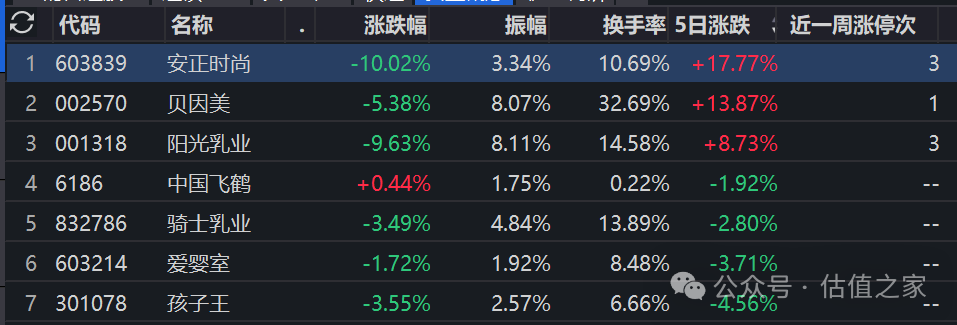 然而,这场资本盛宴“来得快去得更快”。8月1日,母婴概念股集体出现大幅震荡;至8月4日,板块更是全线回调,其中阳光乳业单日重挫9.6%,贝因美下跌超5%,而安正时尚的波动更为剧烈,当日直接封死跌停板。