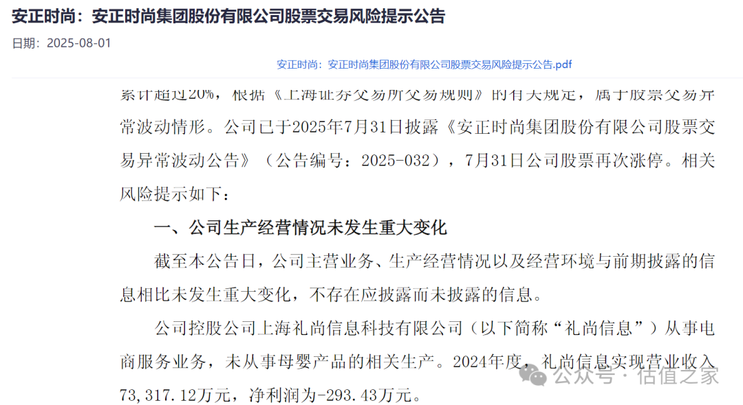 安正时尚的澄清公告中只说明礼尚信息未从事母婴产品的相关生产,并未提及核心业务是为母婴品牌提供代运营服务,也未提及公司实际经营着童装业务。这种有选择性的信息披露,像是从"蹭概念"急转为"撇清关系"的极端。